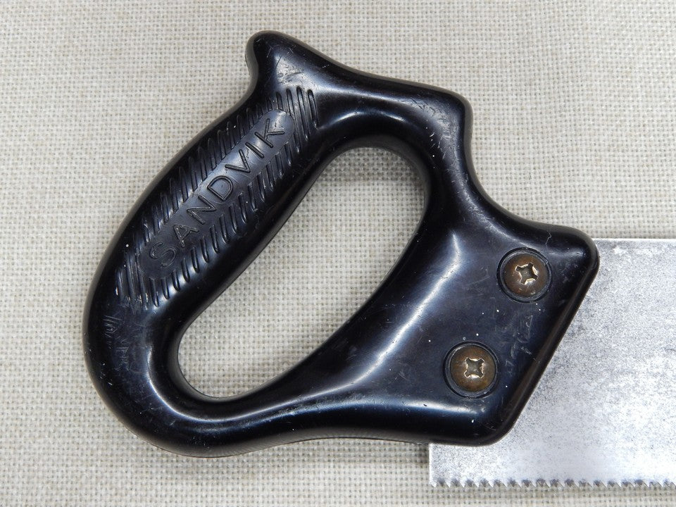 Here is an interesting Sandvik flooring saw from the 1970s. The 12 inch long plate is in excellent condition, with teeth along the cutting edge and on the curved nose. The handle, made of black plastic, is solid with no chips or cracks.