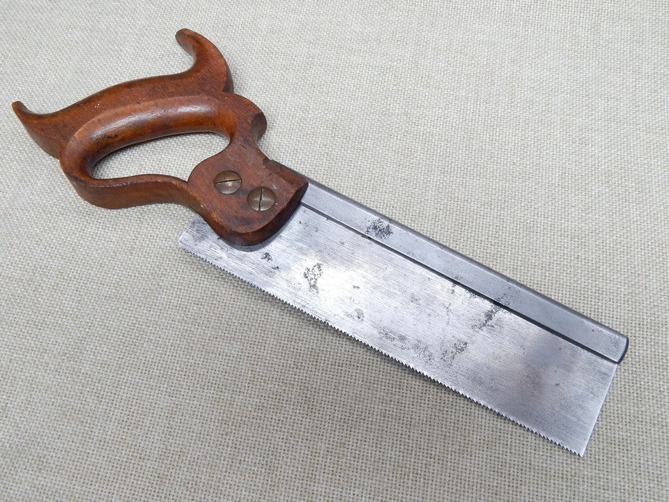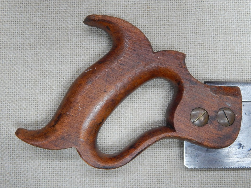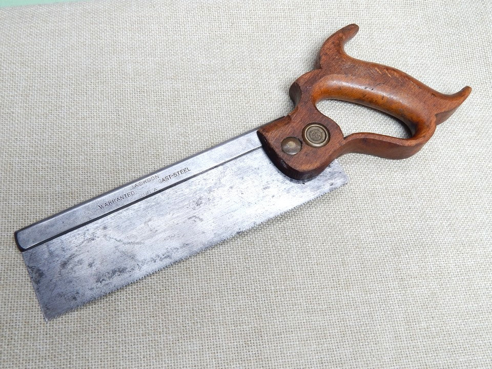Here is a nice Jackson 8 Inch Dovetail saw. Jackson was a secondary brand of Disston. Other than for the less costly beech handle, it is equal in every way to Disston's backsaws. The handle itself is in excellent condition with no major chips or breaks.
