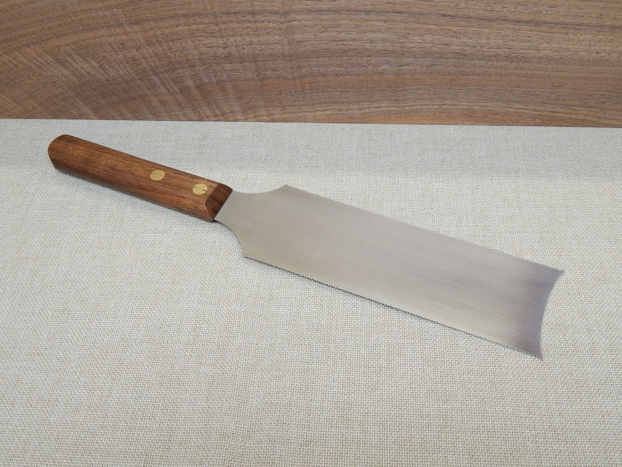 The Loon Lake Tool Works flush cut saw is completely hand-made and hand-sharpened. The 0.020 inch thick spring steel plate measures 8 1/2 inches long and 3 inches wide at the tooth line. The highly flexible blade allows the saw to be held flat against the workpiece. There are 14ppi crosscut teeth on each side, which cut on the pull stroke. The hand-shaped handle is made of quartersawn walnut and held in place with brass split nut fasteners. The trademark loon is marked on the plate using a traditional acid-etching process.